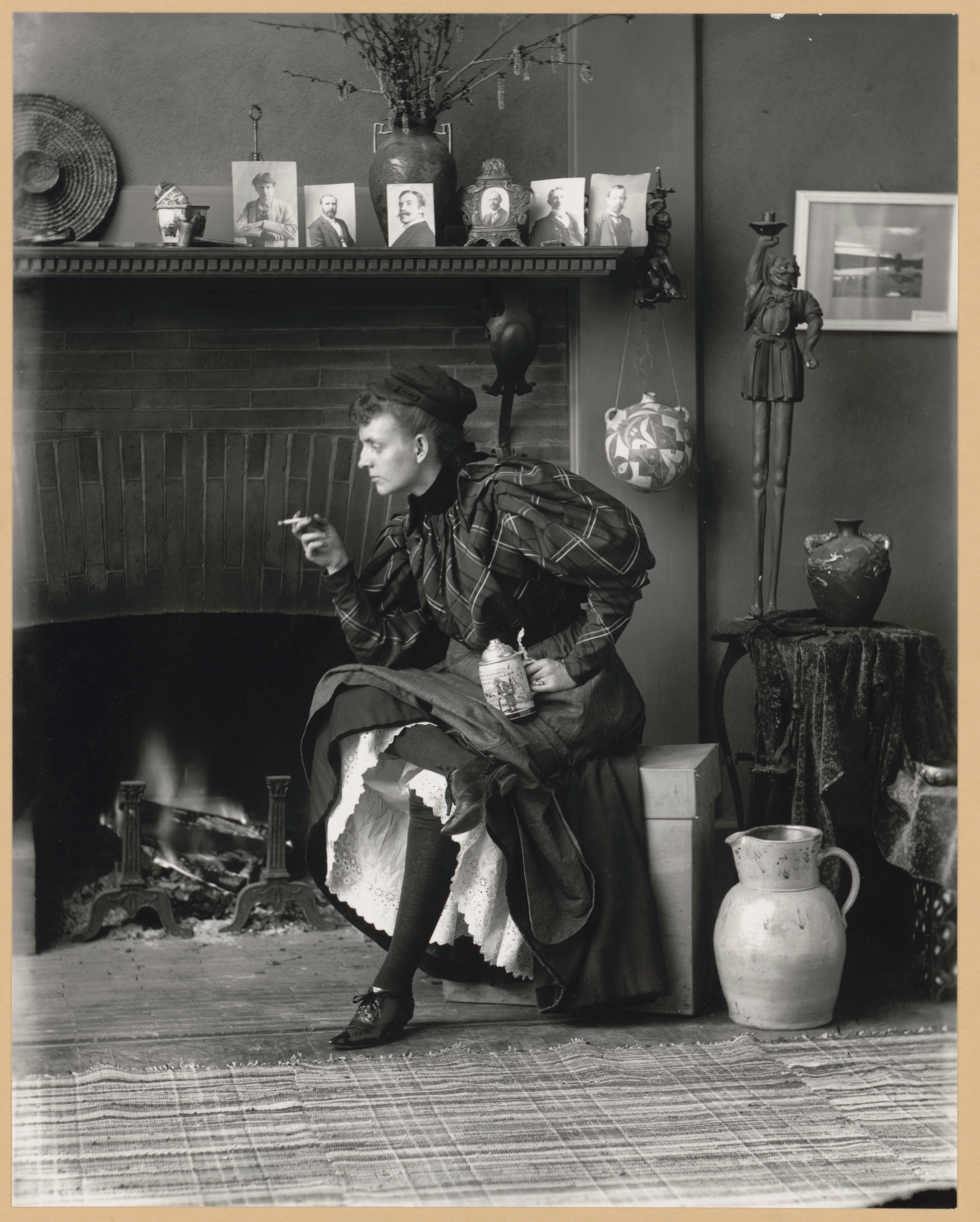 English: Frances Benjamin Johnston's Self-Portrait (as "New Woman"), a full-length self-portrait of her seated in front of fireplace, facing left, holding cigarette in one hand and a beer stein in the other, in her Washington, D.C. studio |