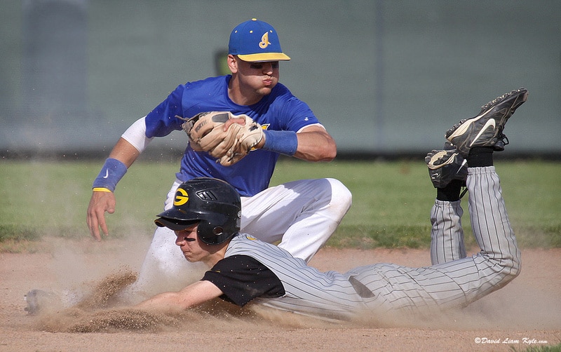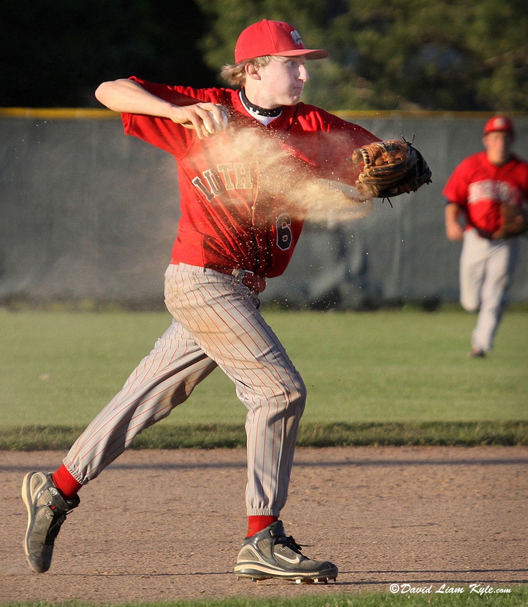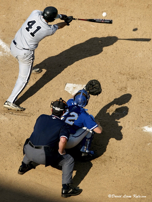 The Wider, the Better: Always try to shoot “wide open.” That means setting and shooting with your aperture set at F/2.8, F/4 or F5.6 depending on your lens. I usually shoot in Manual or Aperture Priority Mode at the widest setting possible. The bigger the aperture opening, the less depth of field you will have, isolating your subject from the background. The wide open aperture will also let more light into your camera, creating a faster shutter speed. You usually need to have your shutter speed at least at 1/1000 of a second to stop the action. It is recommended to shoot at 1/2000 or faster to stop super fast action, such as a pitcher’s throwing motion or a swinging bat. Adjust your ISO in your camera to accomplish the correct shutter speed. For the best quality of images, you want to keep your ISO as low as possible. Take a couple of test exposures to double-check this, because the dark background or bright white uniforms can trick your meter and over or under expose your main subject. Know how your camera works and set it accordingly. I also use the Continuous Focus setting and one center focus point in my camera. That way your camera focusing system is not jumping around, and you have more control of what you want in focus.