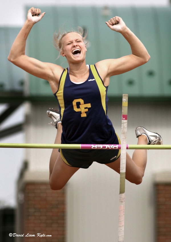 The best part about track is that the events are all scheduled, and you know exactly where the athletes are going to be running or jumping. This allows you to plan ahead for some creative angles. The worst part about track is that a lot of events are happening at the same time, and you obviously can’t be in two places at once. So get yourself a schedule and plan what events you will be photographing. Look at different shooting positions. Can you get some interesting angles from the stands? Can you get inside the track? I took this low angle silhouette photo by focusing on the first hurdle and then setting my camera on the ground and composing the image. I employed manual exposure to expose for the sky and used a 17mm lens at F/14 at 1/1000 to stop the action.