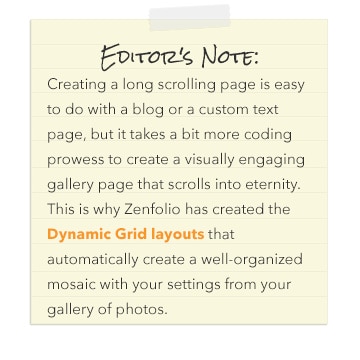 One of my personal favorites, this category embraces new and interesting ways to display your images, for example, grids and photo strips. The grid layout is very versatile because it can be tailored to best showcase the type of work you are presenting. I have seen photographers use this to showcase specific types of portraits, and I appreciate the consistency in the quality of their work, all showcased in a beautiful presentation. The photo strip is equally awesome as it creates a scrolling navigational storyboard within a gallery. I love the fact that images can be presented right up against each other—reminiscent of our old friend, the negative—creating interesting juxtapositions of light, color, contrast and subject matter. The new gallery options help your images sing and keep visitors coming back for more.