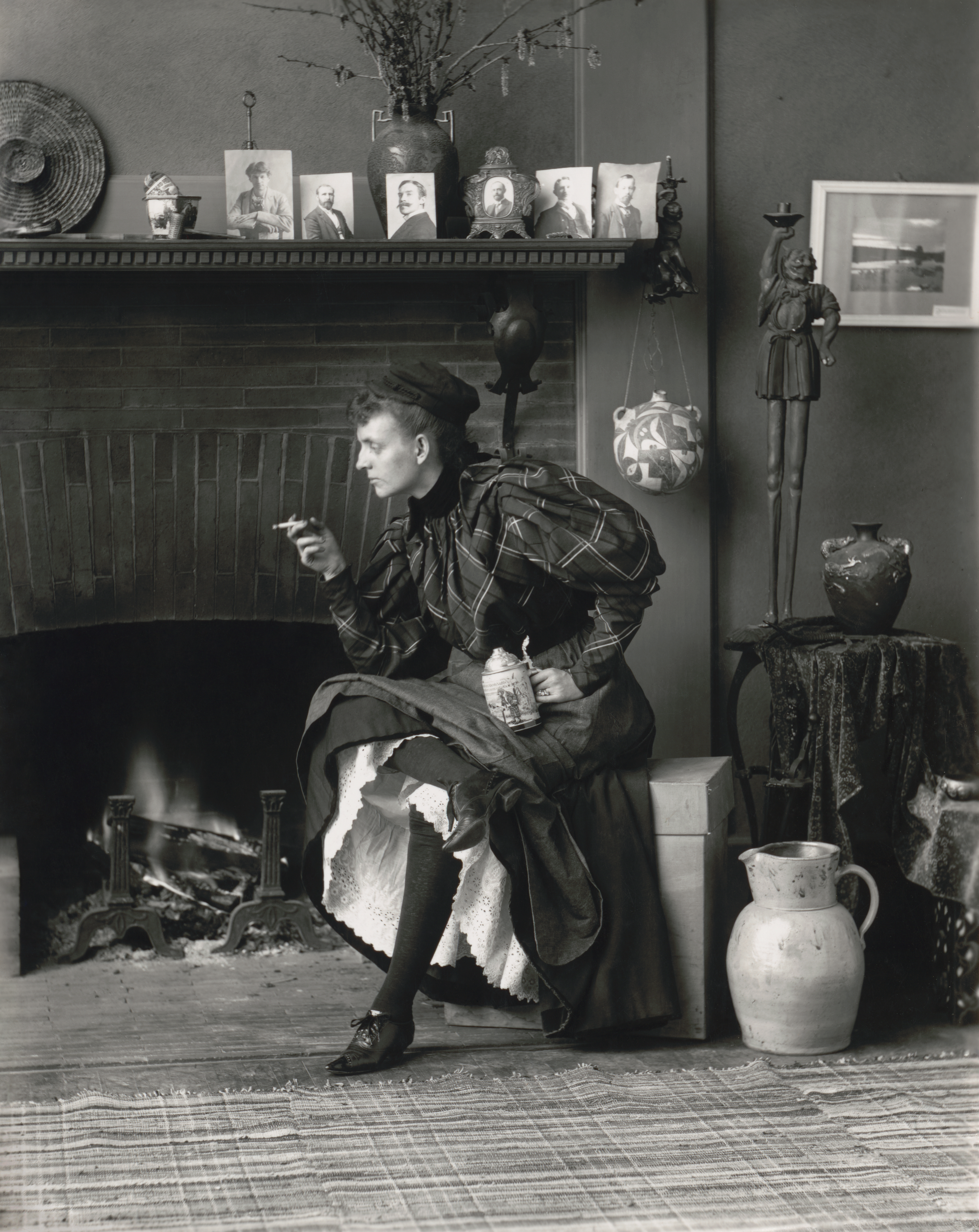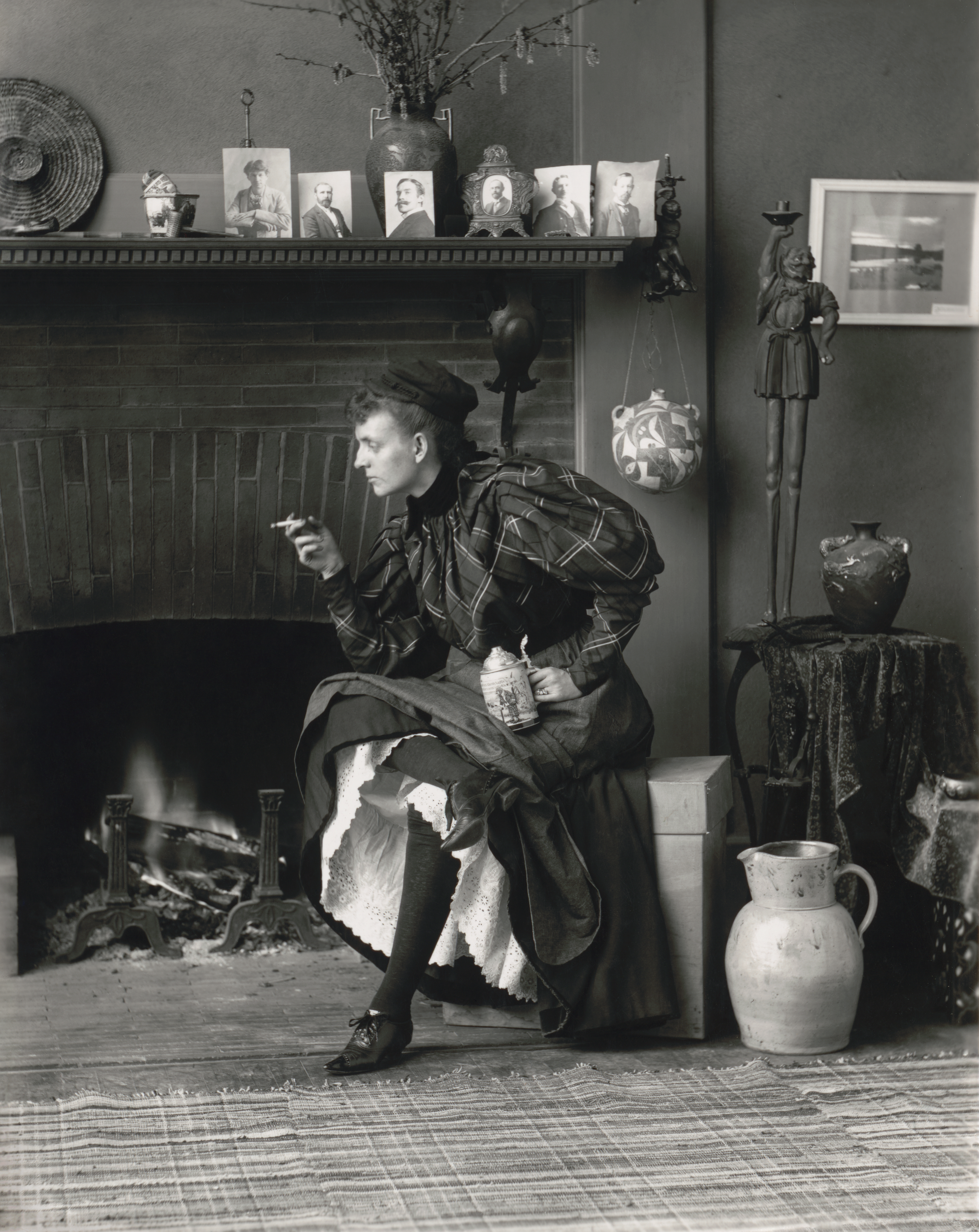 English: Frances Benjamin Johnston's Self-Portrait (as "New Woman"), a full-length self-portrait of her seated in front of fireplace, facing left, holding cigarette in one hand and a beer stein in the other, in her Washington, D.C. studio |