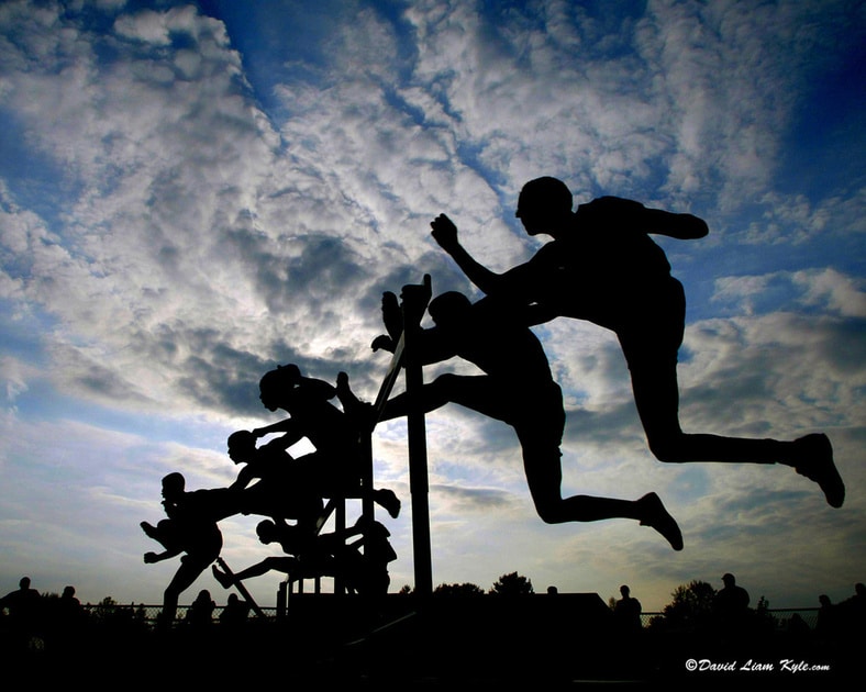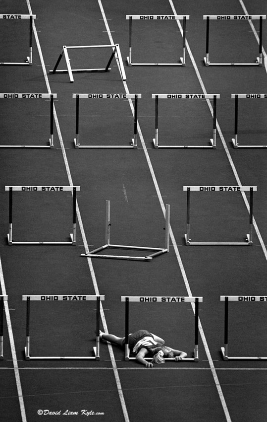 The best part about track is that the events are all scheduled, and you know exactly where the athletes are going to be running or jumping. This allows you to plan ahead for some creative angles. The worst part about track is that a lot of events are happening at the same time, and you obviously can’t be in two places at once. So get yourself a schedule and plan what events you will be photographing. Look at different shooting positions. Can you get some interesting angles from the stands? Can you get inside the track? I took this low angle silhouette photo by focusing on the first hurdle and then setting my camera on the ground and composing the image. I employed manual exposure to expose for the sky and used a 17mm lens at F/14 at 1/1000 to stop the action.