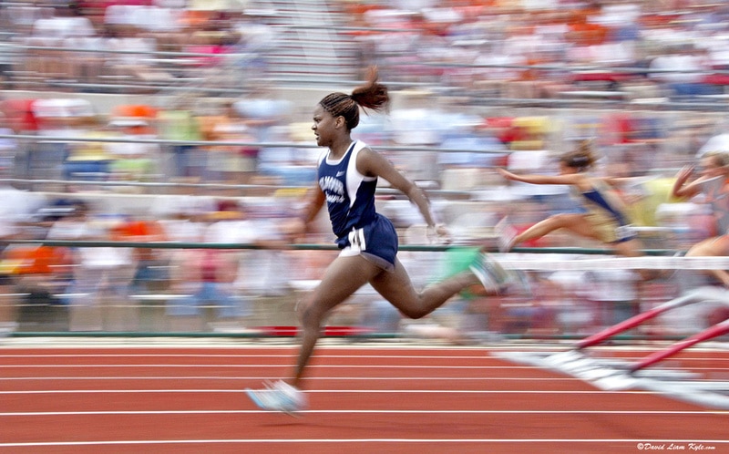 A Fan of the Pan: Another artistic way to capture amazing sports action is by panning. When photographing a moving athlete, the panning technique is achieved by keeping your main subject in the frame for the entire time of the exposure. The slower your shutter speed, the more unusual and interesting the effect. Pre-focus on the runner’s lane and start following your subject before you press the shutter release button. I generally tuck my elbows into my chest and turn at my waist, following my main subject as I press the shutter release button. Follow the runner all the way through and do not jerk or stop your camera as you are shooting. Don’t be afraid to use your motor drive if you have one. Generally, the faster your subject, the faster your shutter speed. This technique will take some practice and some experimenting with different shutter speeds to get your desired image.