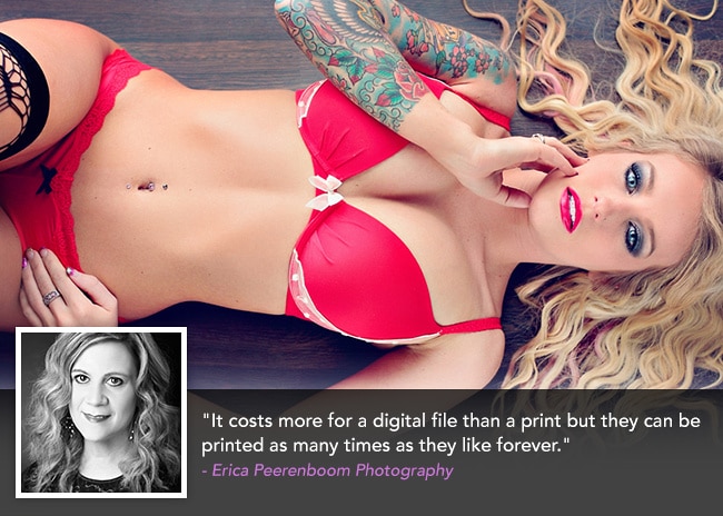 Buying digital files is good if the customer wants to print in bulk. “It’s good for a client if they want to print several copies of one file,” says senior portrait and boudoir photographer Erica Peerenboom. “Or if they are doing graduation or engagement announcements.”